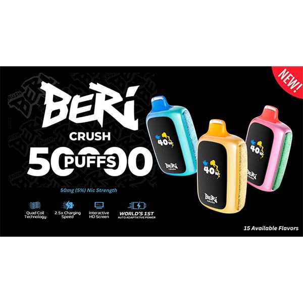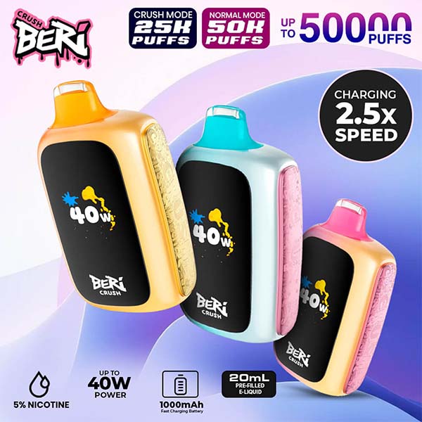 The Beri Crush 50K Puff Disposable Vape features a larger e-liquid capacity with 5 mg of nicotine strength for delivering up to 50,000 puffs. Moreover, this high-end disposable vape offers a standout function with the innovative Crush Mode, which activates a powerful 40 W boost with a simple button press, making it the first disposable to offer such high power. Additionally, the auto-adaptive power feature in Normal Mode adjusts between 15 W and 25 W to optimize performance. The device is powered by a 1000 mAh fast-charging battery, which charges from 0 to 80% in just 15 minutes, ensuring minimal downtime between sessions. With advanced quad coil technology, it delivers richer flavors and smoother vapor, while the 1.77” HD display allows users to easily check the device’s status.