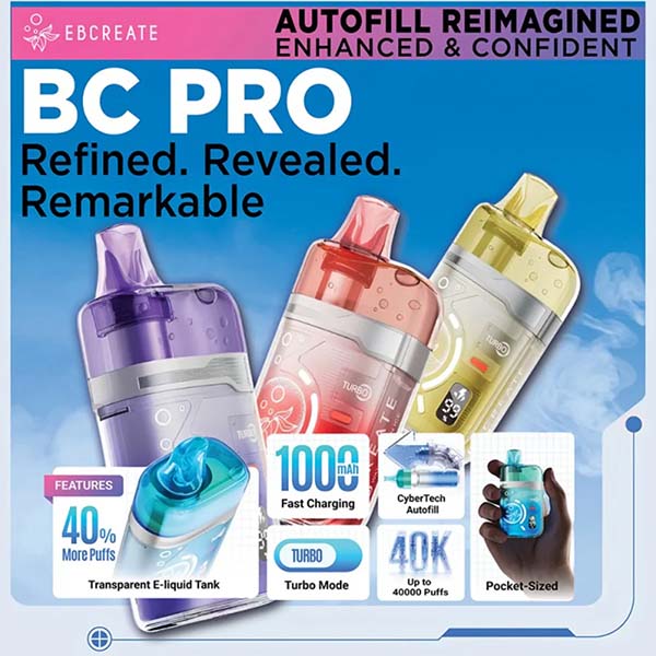 Level up your vape with the EBCREATE BC Pro 40K – a powerhouse disposable crafted for flavor lovers and tech enthusiasts. Featuring dual mesh coils, Autofill, and a smart LED display, this rechargeable device offers 17mL of e-liquid and up to 40,000 puffs. With 15 bold flavors, it’s all about bigger clouds, better taste, and full control.