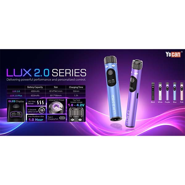 The Yocan Lux 2.0 Dab Pen Battery is an upgraded, portable vaporizer designed for both wax and oil enthusiasts. Featuring precise voltage control (1.8V–4.2V), a clear OLED display, and dual adjustment controls, it offers customizable and smooth sessions. Its 510-threaded stainless-steel body ensures universal compatibility and durability. Available in 400mAh and 650mAh battery options with USB-C charging, it delivers power and convenience in a sleek, pocket-friendly design. Choose from stylish colors like black, white, purple, blue, and pink.